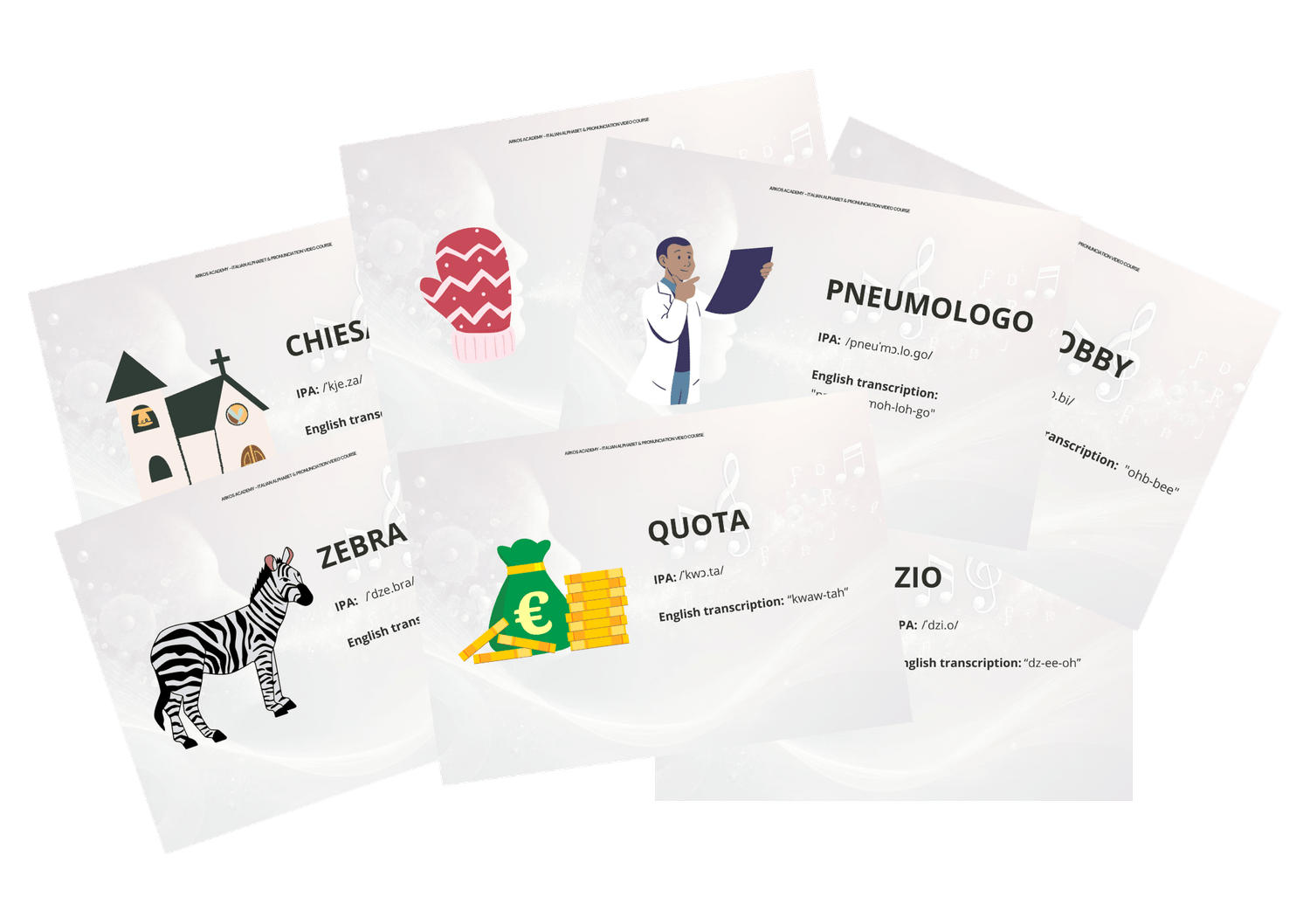 Downloadable flashcards featuring illustrations, IPA pronunciation, and simplified English transcription: perfect to reinforce your Italian pronunciation.